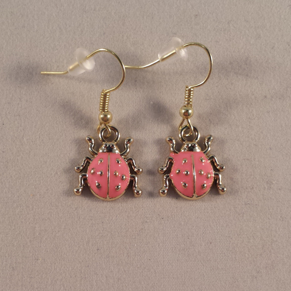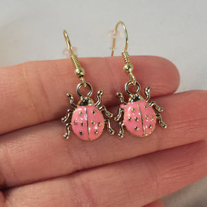 Beautiful chic pink lady bug charm dangle earrings gold plated hand oil painted with hypoallergenic hooks. Brand new and never been worn. Lead and nickel free. Rubber backs included. These pretty earring sparkle.