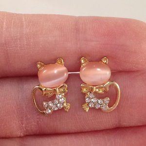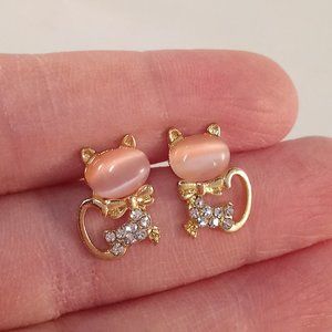 Beautifully crafted classic design crystal cat stud earrings yellow gold plated with sparkling pink opal + small round simulated diamond crystal stones. Polished shine, brand new, never been worn. Lead, nickel free. These earrings sparkle.