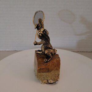 Gold Plated Rabbit Hare Playing Tennis on Petrified Wood/Agate Ron Lee 1980s