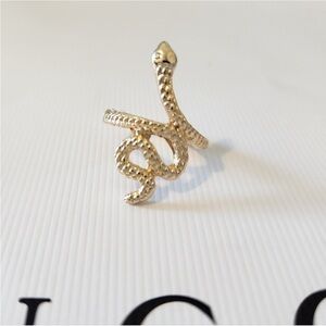 This stunning gold plated snake design statement ring is the perfect addition to your jewelry collection. The intricate snake design wraps elegantly around your finger, creating a unique and bold look. The ring is brand new and has never been worn, making it an excellent choice for anyone looking to add something special to their accessories. It is approximately a size 6. Whether you're styling it for a night out or adding a pop to your everyday look, this ring is sure to make a statement!