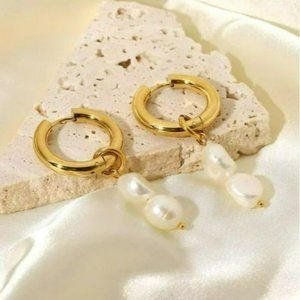 Gold Plated Stainless Steel Hoop Earrings With Dangle Freshwater Pearls