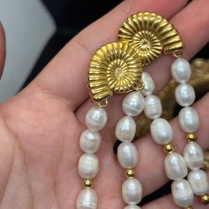 These exquisite earrings are a blend of classic elegance and oceanic inspiration. With gold-plated nautilus shell designs at the top, they descend into three rows of lustrous freshwater pearls, making them a statement piece perfect for both formal occasions and day-to-night transitions. The high-quality PVD real gold plating ensures long-lasting wear without tarnishing, and the stainless steel base offers durability. Make these standout earrings the centerpiece of your jewelry collection!