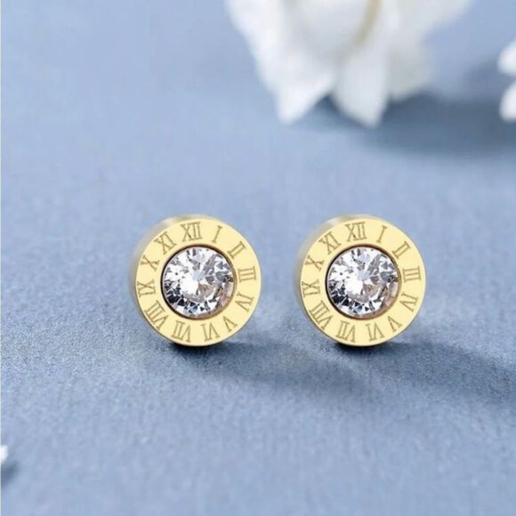 Gold Plated Stainless Steel Rhinestone Roman Number Stud Rhinestone Earrings