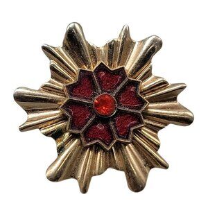 Gold Plated Star Burst Brooch Flower Center Red Rhinestone Accenr Vintage