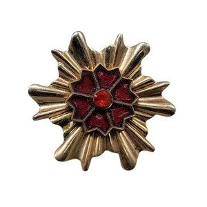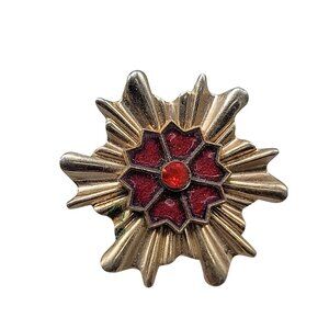 Add a touch of vintage glamour with this gold-plated starburst brooch, featuring a flower center adorned with a striking red rhinestone accent. Perfect for any occasion, this brooch is a timeless accessory that adds elegance to any outfit.