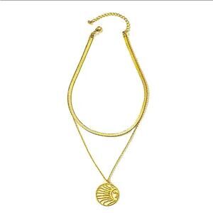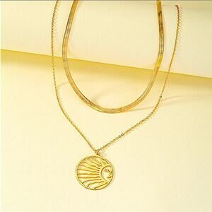Gold Plated Sun Necklace, Herringbone, Hollow Out, Boho, Multilayer