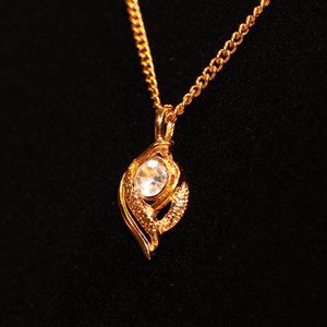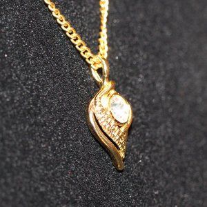 The pendant is 14 karat gold plated with a glass stone in the middle, and the pendant is in the shape of a teardrop