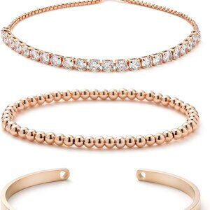 Features: A stunning set of three gold-plated bracelets including shiny cubic zirconia tennis bracelet, a sleek cuff, and a sweet copper beaded chain. Each piece shines with a premium-quality stone and a smooth, comfortable fit. The tennis bracelet features 22 Zircons with a 'Hearts and Arrows' cut, providing maximum dazzle. The bracelets are lightweight yet sturdy, with an easy-to-adjust sliding buckle to fit wrists from 6 to 8.5 inches.
