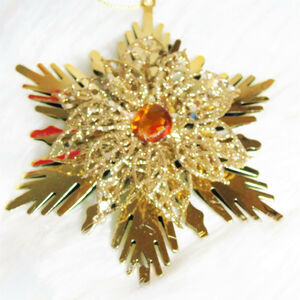 Gold Poinsettia Christmas Tree Ornament Snowflake 5" Metal Rhinestone New