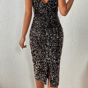 Gold Preppy Womens Fuzzy Trim Sequin Backless Bodycon Dress