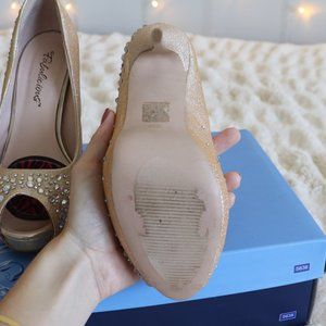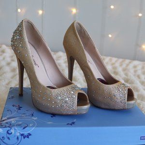 These beautiful golden heels with gorgeous iridescent rhinestones are great for Homecoming, Prom, Pageants, or a Ball!