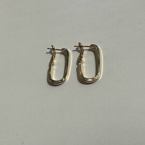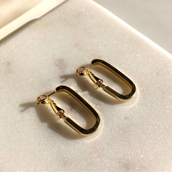 Elevate your everyday jean and t shirt look with these chic gold rectangular hoop earrings.