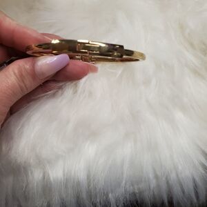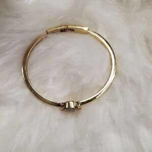 Gold-tone bangle bracelet featuring a circle of rhinestones in the center and a lock clasp style.