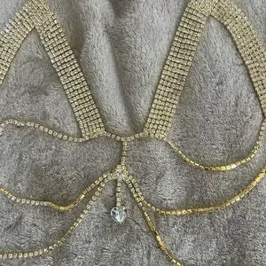 Elegant gold rhinestone body chain with heart pendant. Perfect for adding sparkle to any outfit or for your next festival or rave! ✨