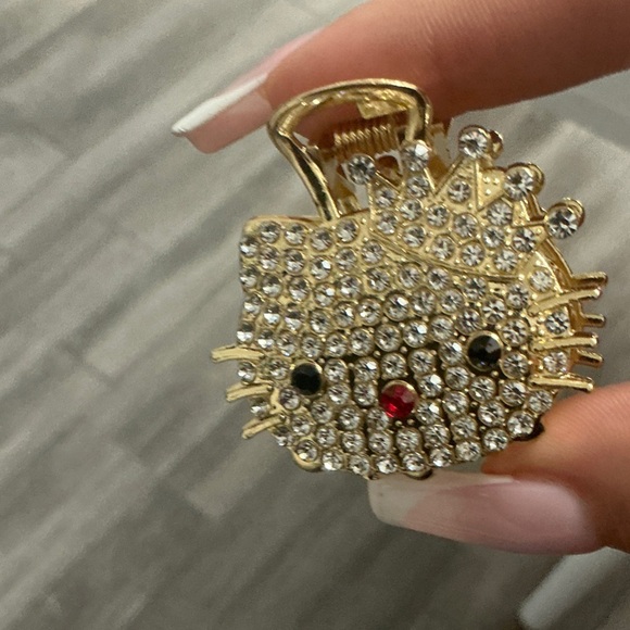 Sparkling gold cat keychain with rhinestones. Features black and red accents.