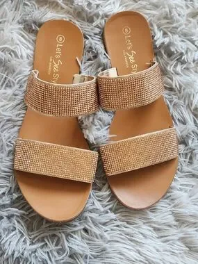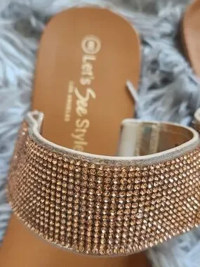 women's slide sandals in gold. Shimmery rhinestone double straps add eye-catching sparkle. Cushioned footbed and easy slip-on design for comfortable everyday wear. Versatile gold tone pairs well with casual and dressy looks. Worn maybe one time.