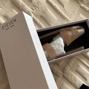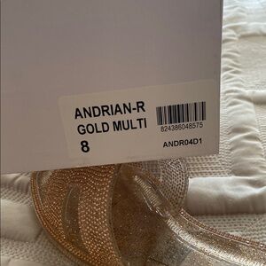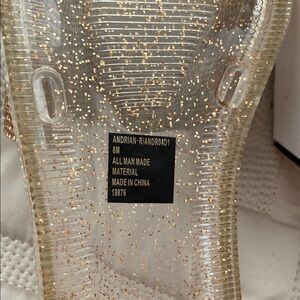 These gold slide sandals feature a shimmering rhinestone-adorned upper, offering a touch of glamour to any outfit. The open-toe design and slip-on style ensure easy wear and comfort. Perfect for adding a sparkling finish to your look.