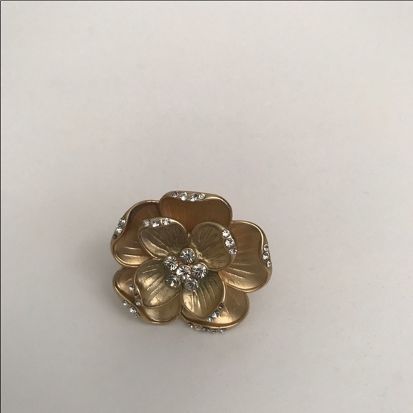 This is a gold flower ring with rhinestone detail.