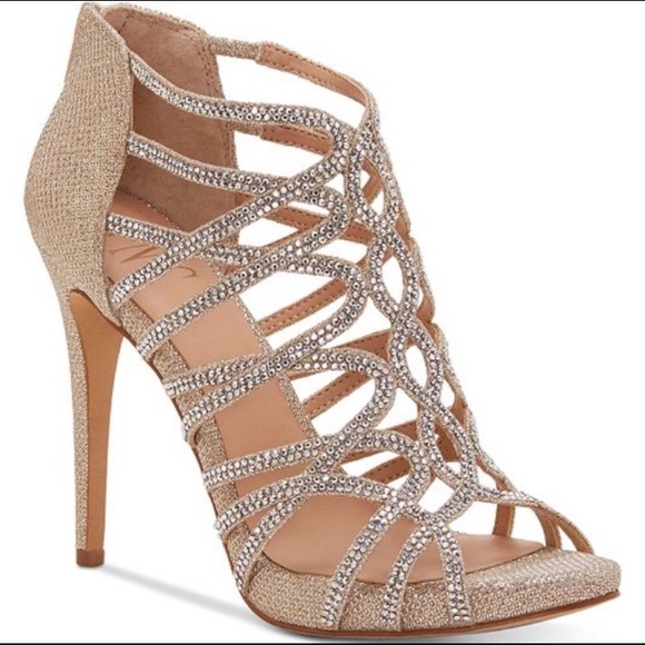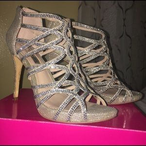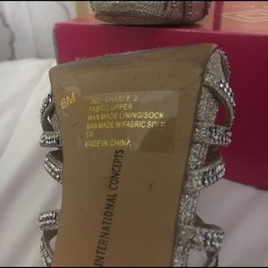 There are rhinestones on the cage straps, with a sparkle materal on the rest of the shoe. Memory foam sock for added comfort. Functional zipper in the back of the heel. 4 1/4" heel, 1/2" platform.
