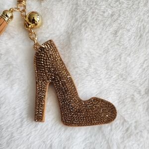 Sparkling gold rhinestone soft high heel keychain with tassel accent. Perfect for adding a touch of glamour to your keys.