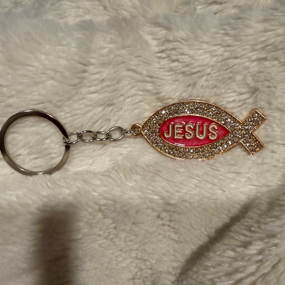 Sparkling gold-tone Jesus fish keychain. Red enamel center with raised JESUS lettering. Rhinestone border adds shine. Secure keyring and chain attached.