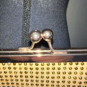 Gold Rhinestone, Kiss Closure Bag, Purse, Shoulder Evening Bag, Gold Tone Hardware in excellent condition!! No missing rhinestones! Black interior pouch with small pocket no stains or holes. Gold tone chainlink shoulder strap 23”