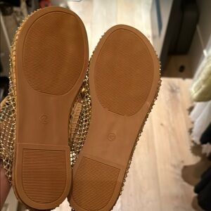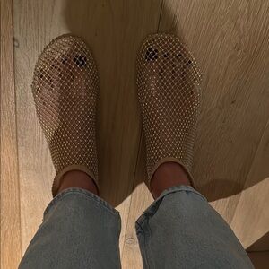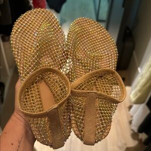 Sparkling gold rhinestone mesh sandals. Very comfortable, slipper-like shoe that adds something fun to your outfit!
