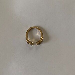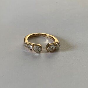 Lovely ring with a gold-colored band and rhinestones. The open design makes this ring stand out even when stacked with others.