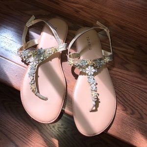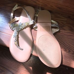 Lightly worn gold rhinestone flower t-strap wide width sandal.