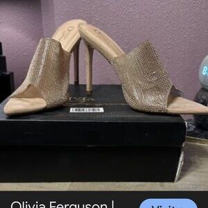 Elegant slide heels with gold rhinestone detailing. Shimmering gold upper adds glamour to evening looks. Comfortable open-toe design and slim stiletto heel for a sleek profile. Perfect for special occasions or a night out.