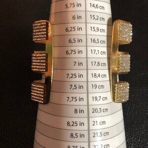 This gold tone bracelet features tiny crystal rhinestones hand set into strips on this massive cuff bracelet. Wonder Woman called and she wants her bracelet back! THIS IS FABULOUSSS girlfriends! Sadly, I only got one. It's nice quality and has an open back so it will fit many sizes of people.