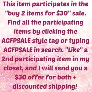 💖 BUNDLE THIS ITEM WITH ANOTHER 2/$30 ITEM IN MY CLOSET, AND I WILL SEND YOU A $30 OFFER ON BOTH! There are hundreds of participating items to choose from. To find these items, type AGFPSALE in the search bar on Poshmark or click the AGFPSALE style tag on this listing!