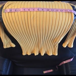 Long sleeve,looks great with a jacket and tall boots. Ribbed material.