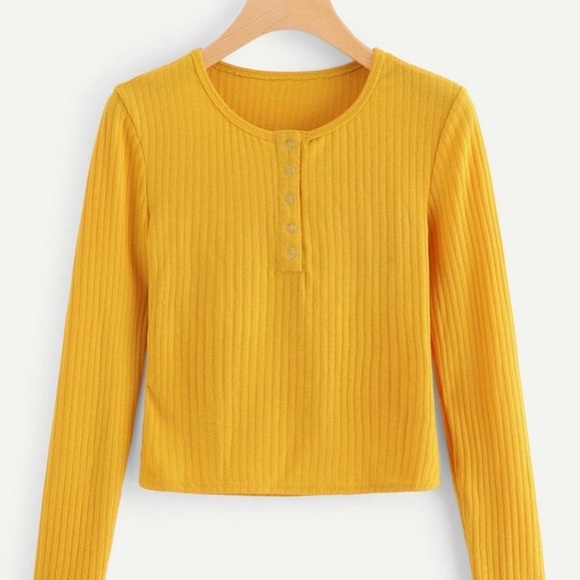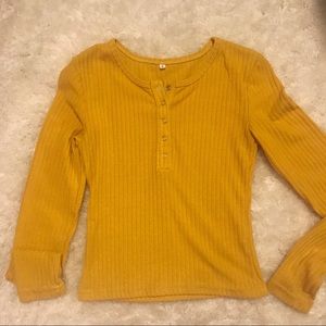 This long-sleeved gold top is from ROMWE in a size Small. It’s in great condition and has only been worn once. No rips or stains. It’s ribbed and also has silver buttons going down the front.