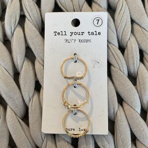 Set of three gold rings. One triangle rhinestone band, one single rhinestone band, and one crescent rhinestone band. Size 7. Wore two of the rings one time for a brief period but they are slightly too big for me. Like new.