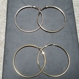 2 pairs of hoop earrings; 1 is rose gold, 1 is yellow gold.