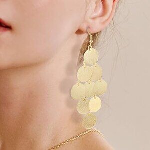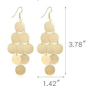 Add a touch of elegance to any outfit with these stunning gold dangle earrings featuring a chic layered disc design. Made from zinc alloy, these earrings are lightweight, comfortable to wear, and perfect for any occasion. The shimmering gold finish catches the light beautifully, making them an eye-catching statement piece for both casual and dressy looks. Whether you're heading to a party, a date night, or just elevating your everyday style, these earrings are a must-have accessory. Brand new and ready to wear!