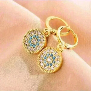 Gold Round Drop Earrings with Turquoise and Clear Stones
