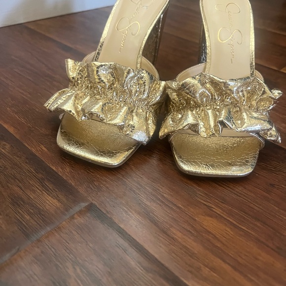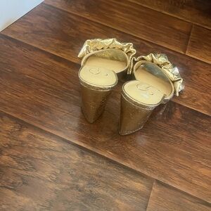 Step out in style with these stunning gold ruffle open-toe heels. Perfect for adding a touch of glamour to any outfit. Wore for a couple of hours.