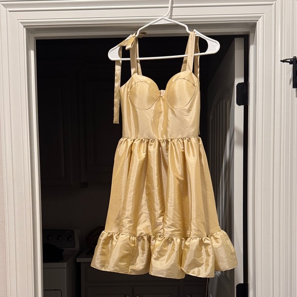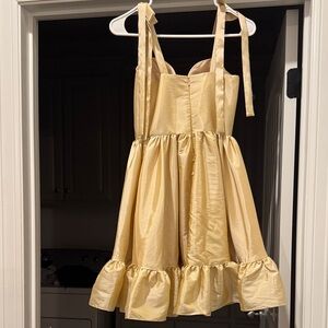 Charming gold dress with ruffled hem and bow straps. Perfect for summer outings.