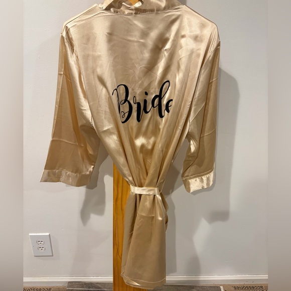Elegant gold satin robe with 'Bride' text. Perfect for weddings.