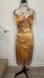 Elegant gold satin dress featuring intricate floral embroidery and lace hem.