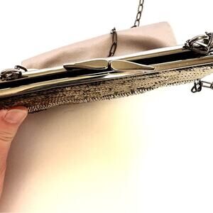 This little sequin and beads bag is just enough for the essentials at a formal event or a night out. It has a chain strap and click shut metal clasp. It measures 5x6, and is in excellent condition.