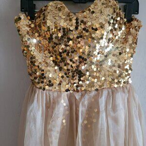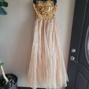 Gold Sequin Strapless Sweetheart Neckline Evening Gown With Sheer Flowing Skirt