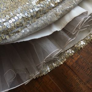 Worn once in excellent condition. Label reads size 11, but this dress was altered and fits more like an 8/10. Has built in cups, so no need to wear a bra. Removable gold sash. Built-in slip and ruffle layer to shape skirt