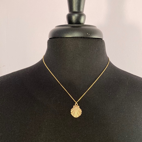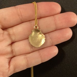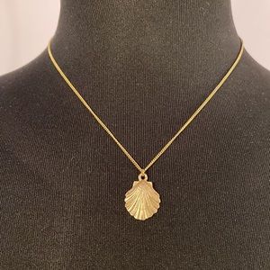 This dainty gold shell necklace is in pristine condition and never worn. The gold shell catches the light very nicely. Total length of chain is 19 inches.