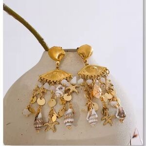 Turn heads with these stunning statement earrings crafted in a unique ocean-inspired design. Featuring natural shells, stone accents, and dangling floral details, these earrings blend elegance with a touch of whimsy.