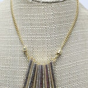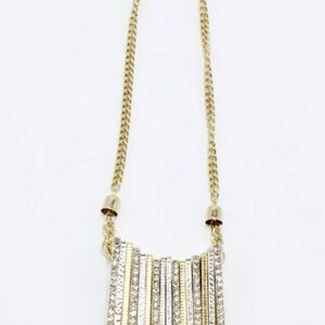 The pendant boasts a cascading fringe design composed of multiple gold and silver-tone bars, each adorned with shimmering pave rhinestones. These bars vary in length, creating a dynamic and eye-catching movement, while the combination of gold, silver, and sparkling stones adds a touch of sophistication and versatility.
