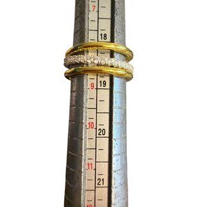 Elegant gold and silver plated triple band stacker ring featuring dazzling CZ stones. Perfect for adding a touch of glamour to any outfit.