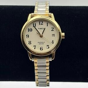 Gold & Silver Timex Watch. Fully functional with brand new batteries. Adjustable metal band fits 6 1/2 in wrist or near. Has a day window!